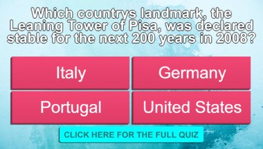In this fun trivia quiz we're going to ask questions like "What language is spoken in France?" and "Which country's landmark, the Leaning Tower of Pisa, was declared stable for the next..".